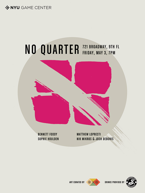 Each year, the NYU Game Center hosts No Quarter, a premiere of games that have been commissioned by the NYU Game Center from game designers and developers all over the world to make a game specifically for a gallery context. Now after our the sixth year, hundreds of people turn out for the exhibition that has launched some of the most successful local multiplayer games in recent history including Nidhogg, BaraBariBall, Hokra, and Killer Queen. No Quarter challenges the standard of social and multiplayer design and brings one of the most exciting nights in indie games to New York City.