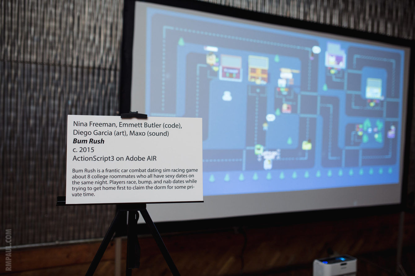 Bum Rush is a frantic car combat dating sim racing game about eight college kids who all have sexy dates on the same night.  Designed by Nina, coded by Emmett Butler with art by Diego Garcia and sound and music from Maxo, players race, bump, and nab dates while trying to get home first to claim the dorm for some private time.